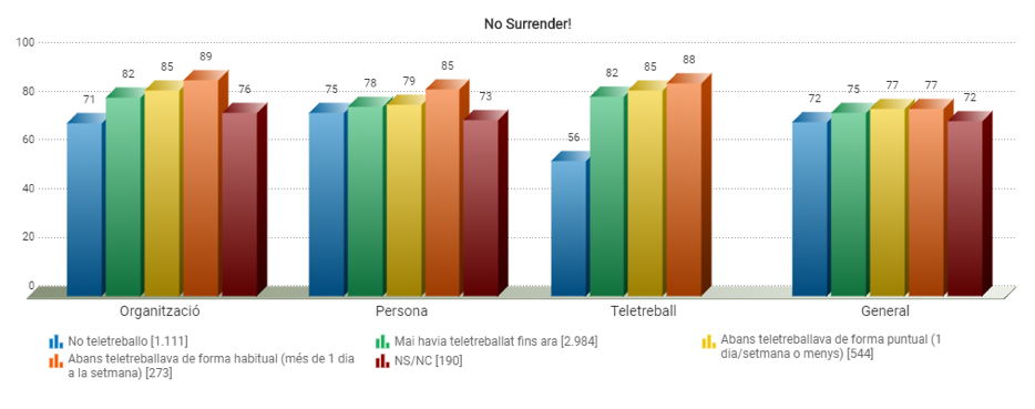 • El grau de teletreball és la variable més significativa: Com més alt és el grau de teletreball, més altes son les valoracions, sobretot en l’opinió que els treballadors tenen de l’organització. enquesta covid19 no surrender