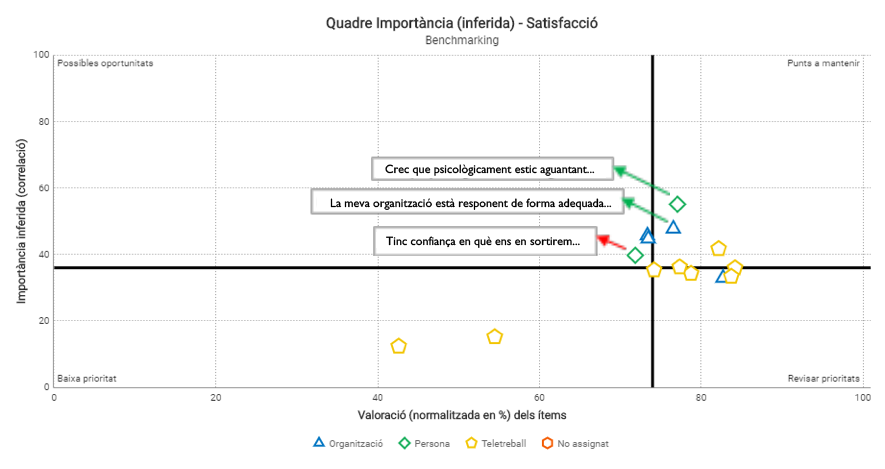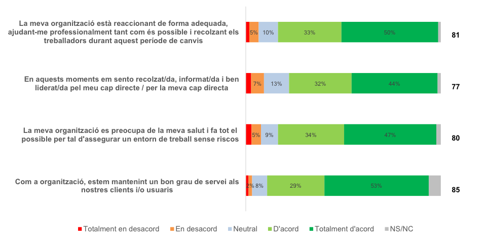 En l’àmbit de la resposta organitzacional a la crisi, la gestió dels equips per part dels caps directes és l’aspecte que obté un resultat més baix (77), amb un 22% de les respostes que són neutres o directament negatives. La resta de preguntes de la dimensió estan igual o per sobre de 80, destacant el 85 del servei als clients.