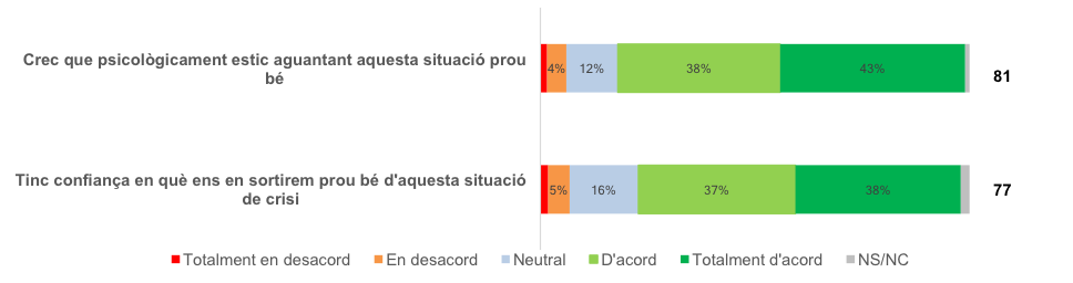 En l’àmbit de la resposta personal a la crisi, la confiança en el futur és la pregunta amb el resultat més baix (77), amb un 23% de les respostes que son neutres o negatives. La resposta psicològica té un resultat més alt (81), però tot i així cal destacar que un 18% de les respostes a la pregunta són neutres o negatives.