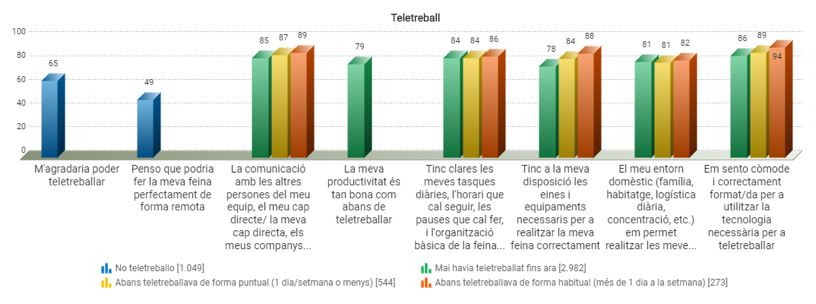 • Les persones que teletreballen (per primer cop o ja des d’abans) responen en general de forma molt positiva a totes les preguntes, amb valors per sobre 78 en tots els casos. En general constatem el bon funcionament del teletreball i la seva acceptació per part dels treballadors.