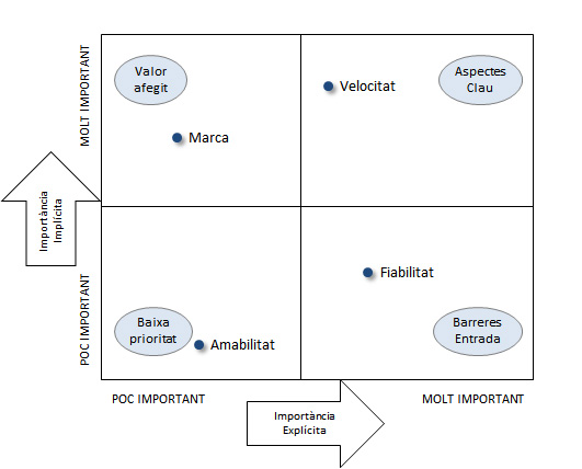 - Punts crítics: Atributs del producte o servei (com ara la velocitat a l’exemple) d’alta importància explícita i implícita, que se solen correspondre amb els aspectes claus per a la venda.