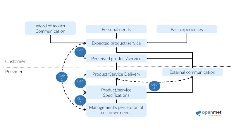 - Gap 5: There is no clear consensus on what this gap means. Initially, it meant the difference between Expectations and Perception of service, which may arise when the customer sees a characteristic of service quality as something undesirable. But this gap is also now used to identify overall customer dissatisfaction, which appears as the result of the sum of the other gaps. At Openmet, we prefer the first of the two versions because it adds to the analysis of the causes of dissatisfaction.
