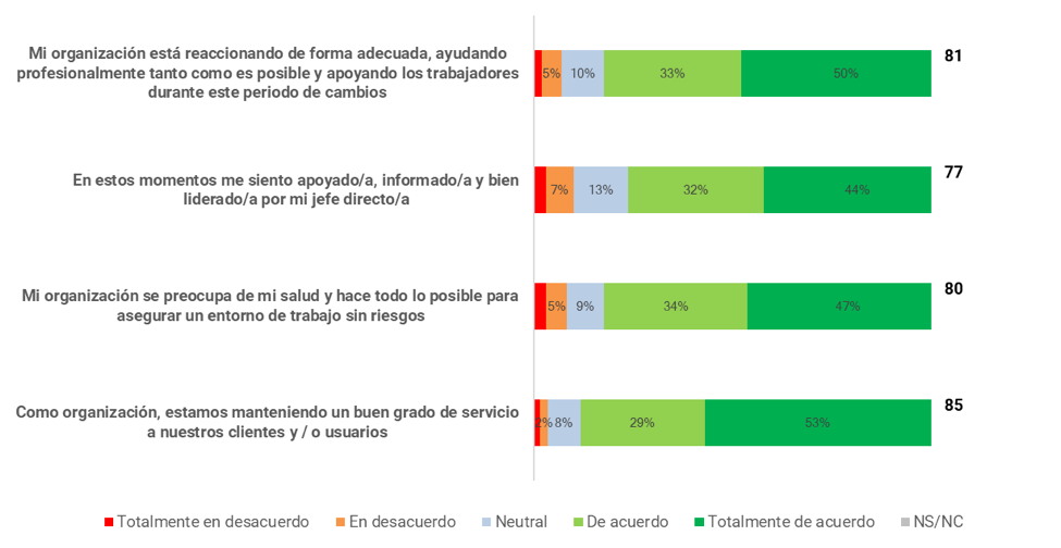 En el ámbito de la respuesta organizativa a la crisis, la gestión de los equipos por parte de los managers directos es el aspecto que obtiene un resultado más bajo (77), con un 22% de las respuestas que son neutrales o directamente negativas. Las otras preguntas de la dimensión tienen valoraciones iguales o superiores a 80, destacando las 85 del servicio a los clientes.