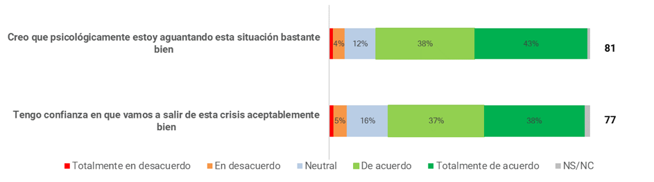 En el ámbito de la respuesta personal a la crisis, la confianza en el futuro es la pregunta con el resultado más bajo (77), con un 23% de las respuestas que son neutrales o negativas. La respuesta psicológica tiene una puntuación más alta (81), pero cabe señalar que el 18% de las respuestas a la pregunta son neutrales o negativas.