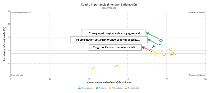 - Con respecto a la relación existente entre la motivación y las otras preguntas de la encuesta, si creamos una matriz DAFO (Debilidades, Amenazas, Fortalezas, Oportunidades) del global de la encuesta, podemos observar que las dos fortalezas (preguntas con correlación moderada y altas valoraciones) son la respuesta psicológica personal y la respuesta de la organización. La confianza en la salida de la crisis es el punto débil (correlación moderada y valoraciones bajas) más evidente.