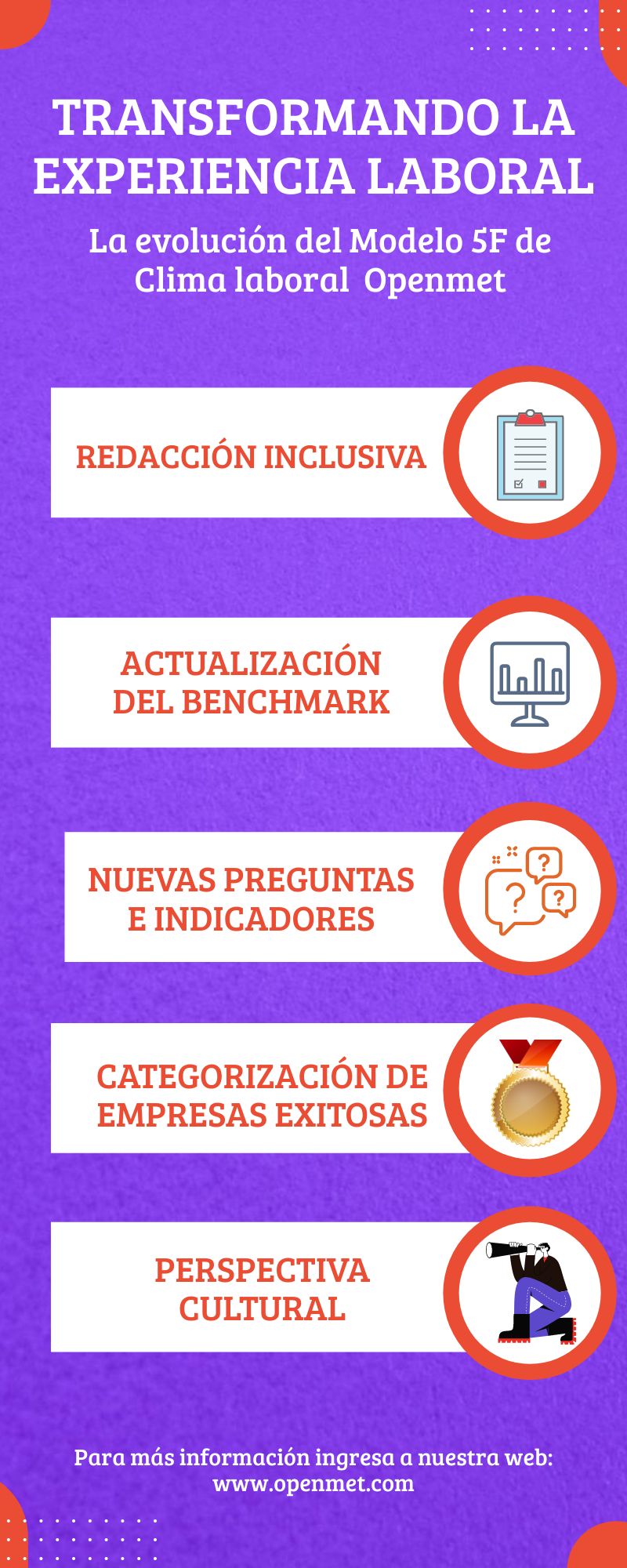 Como Openmet People, líderes en la investigación y desarrollo de herramientas de medición de clima laboral, hemos dado un paso audaz hacia la evolución con cambios significativos en nuestro reconocido Modelo 5F de Clima Laboral. Estas actualizaciones representan una transformación completa que abarca desde la utilización de un lenguaje inclusivo en las encuestas, la integración de una perspectiva cultural, hasta la creación de categorías para empresas exitosas. En este artículo, exploraremos detalladamente los cambios y cómo están impulsando la mejora continua en el mundo del clima laboral.