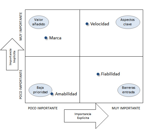 - Baja prioridad: Atributos del producto o servicio (como por ejemplo la amabilidad en el ejemplo) de baja importancia explícita e implícita, que suelen corresponderse con atributos periféricos y de poca influencia en la satisfacción.